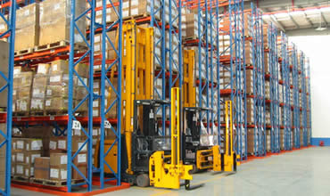 此類倉庫中,低、高位倉庫大多用前移式電瓶叉車、平衡重電瓶叉車、三向叉車進(jìn)行存取作業(yè),貨架較矮時(shí)也可用電動堆高機(jī),超高位倉庫用堆垛機(jī)進(jìn)行存取作